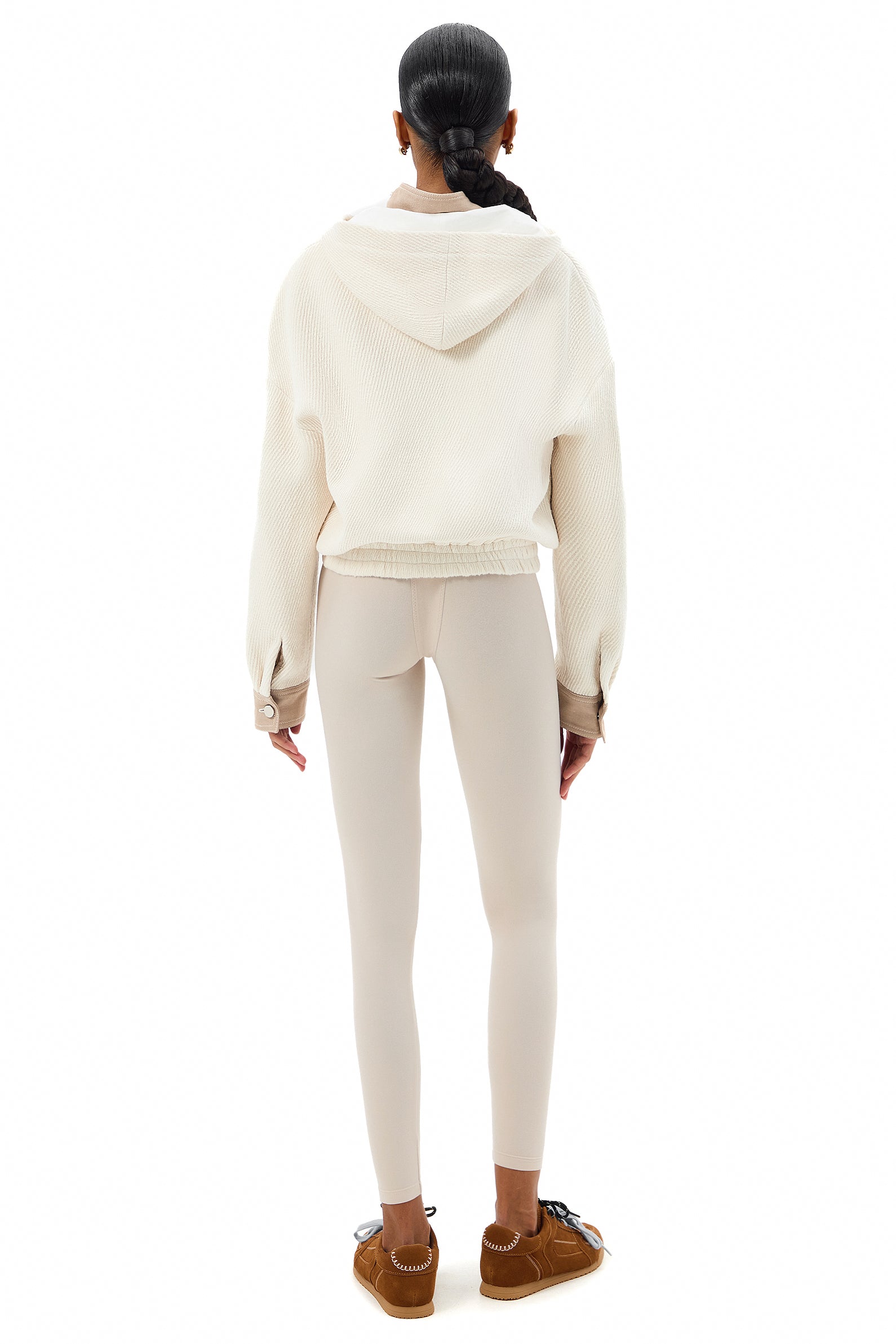 Light beige bomber jacket made from a lambswool and cashmere blend, featuring metallic hardware