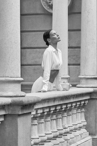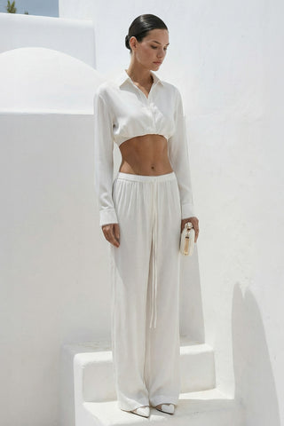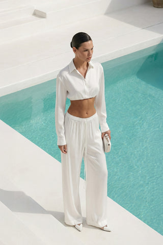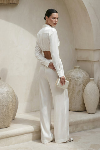 The AMELIA BLANC SILK LACE TROUSERS reimagine classic elegance with a sensual twist. Flowing silk drapes with ease, while the lace-detailed waistband creates a refined play of texture and allure. A statement piece designed to bring both sophistication and modern femininity to your wardrobe.
