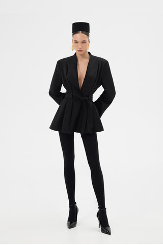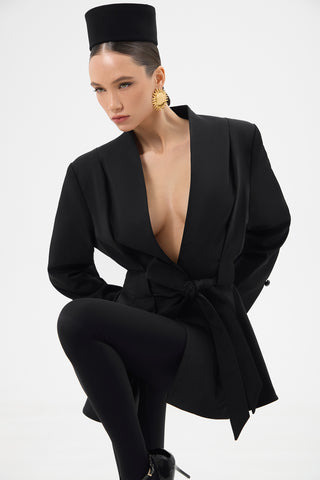 Tailored from premium Italian suiting fabric in an intense black shade, this silhouette is designed to softly drape over the body, with a defined waist emphasized by a long, wide belt. Fully lined with smooth Italian viscose for a clean fit and elevated comfort, the NOIR LONG BELTED BLAZER is a minimal, timeless piece that balances structure and fluidity.