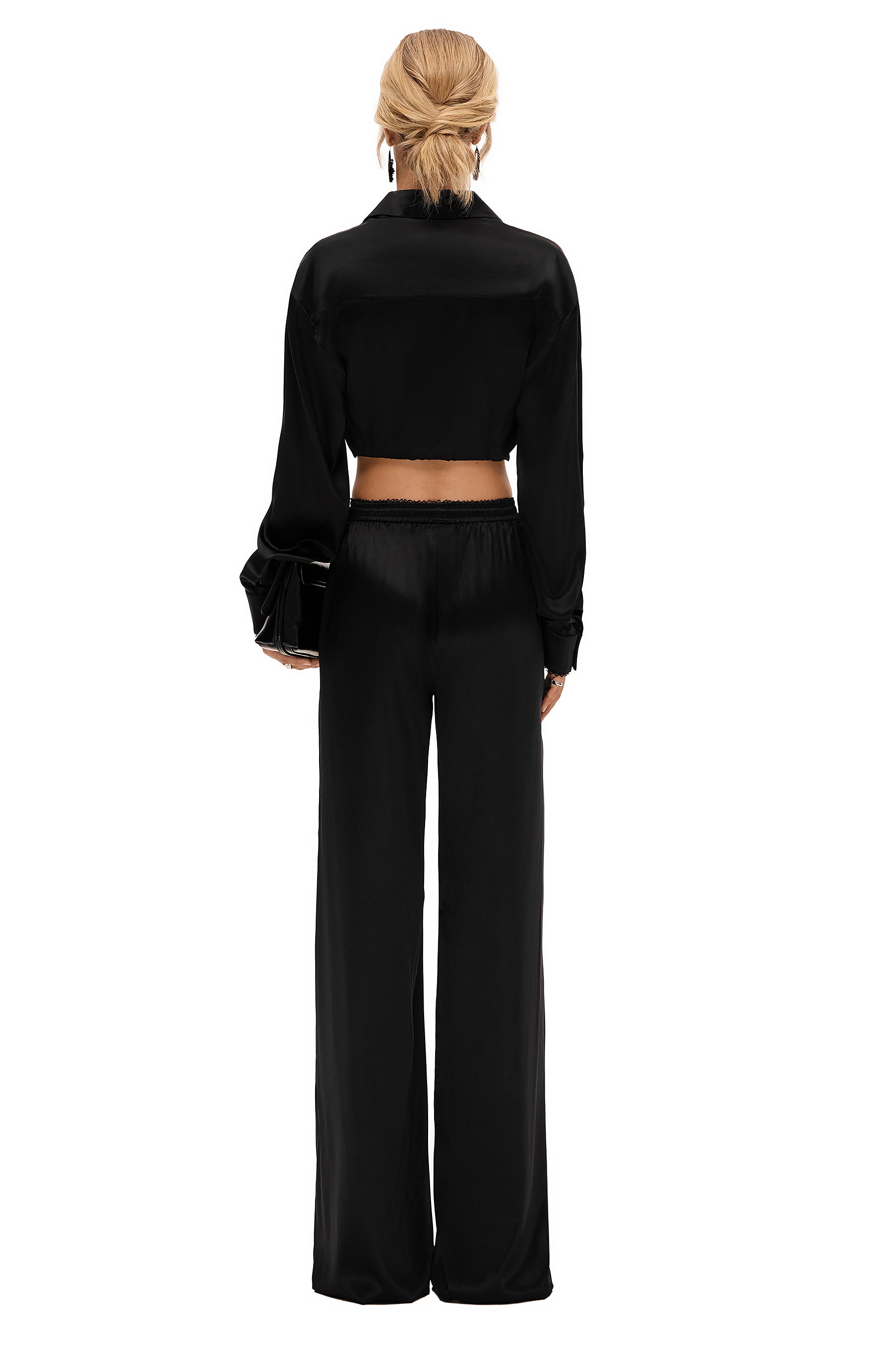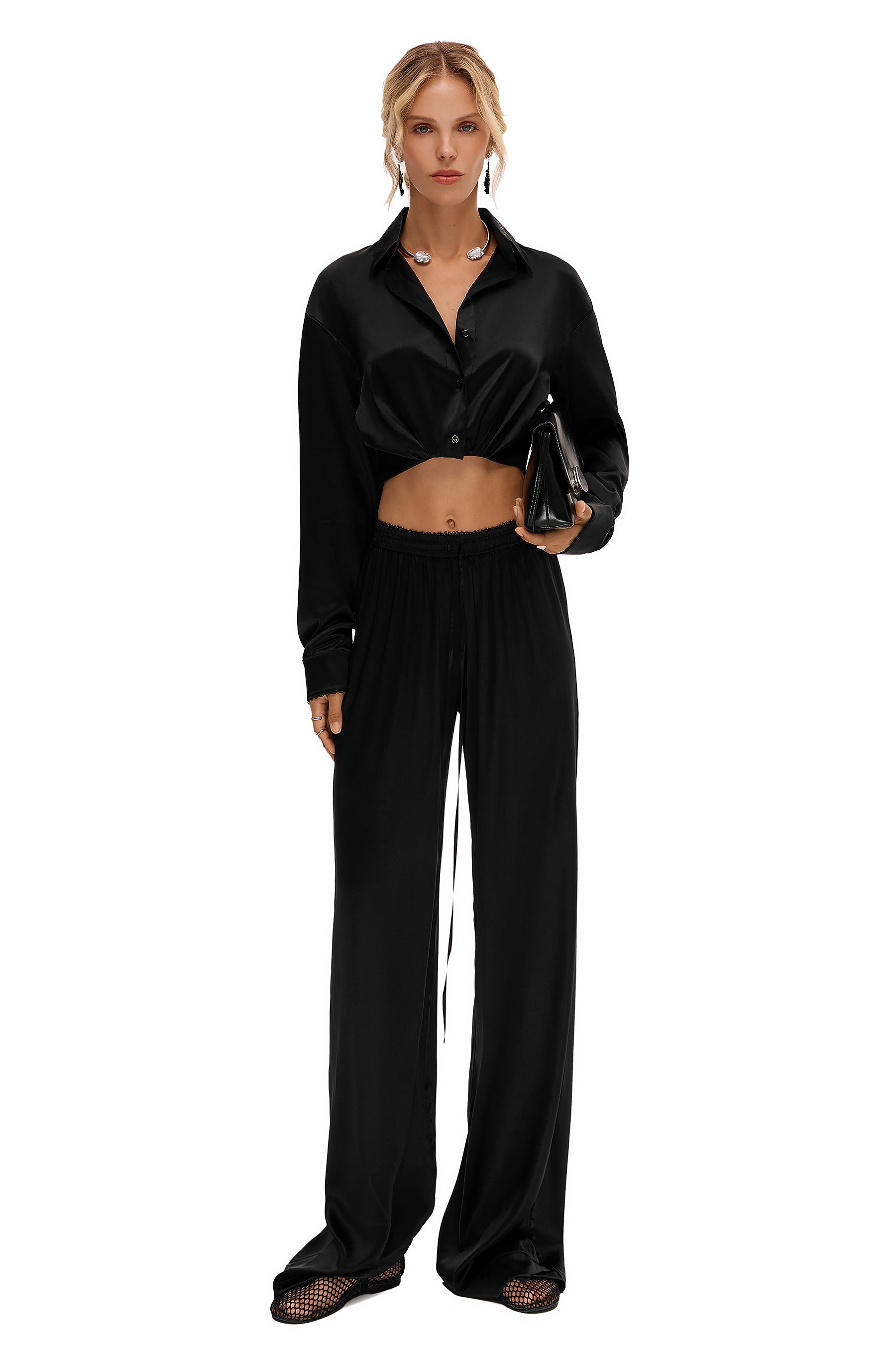 The AMELIA NOIR SILK LACE BLOUSE embodies a sense of quiet luxury and feminine ease. Crafted from fluid Italian silk, it drapes gracefully, creating a soft movement with every step. The lace-trimmed cuffs add a touch of sensual sophistication, while the subtle elastic hem ensures comfort without compromising elegance.