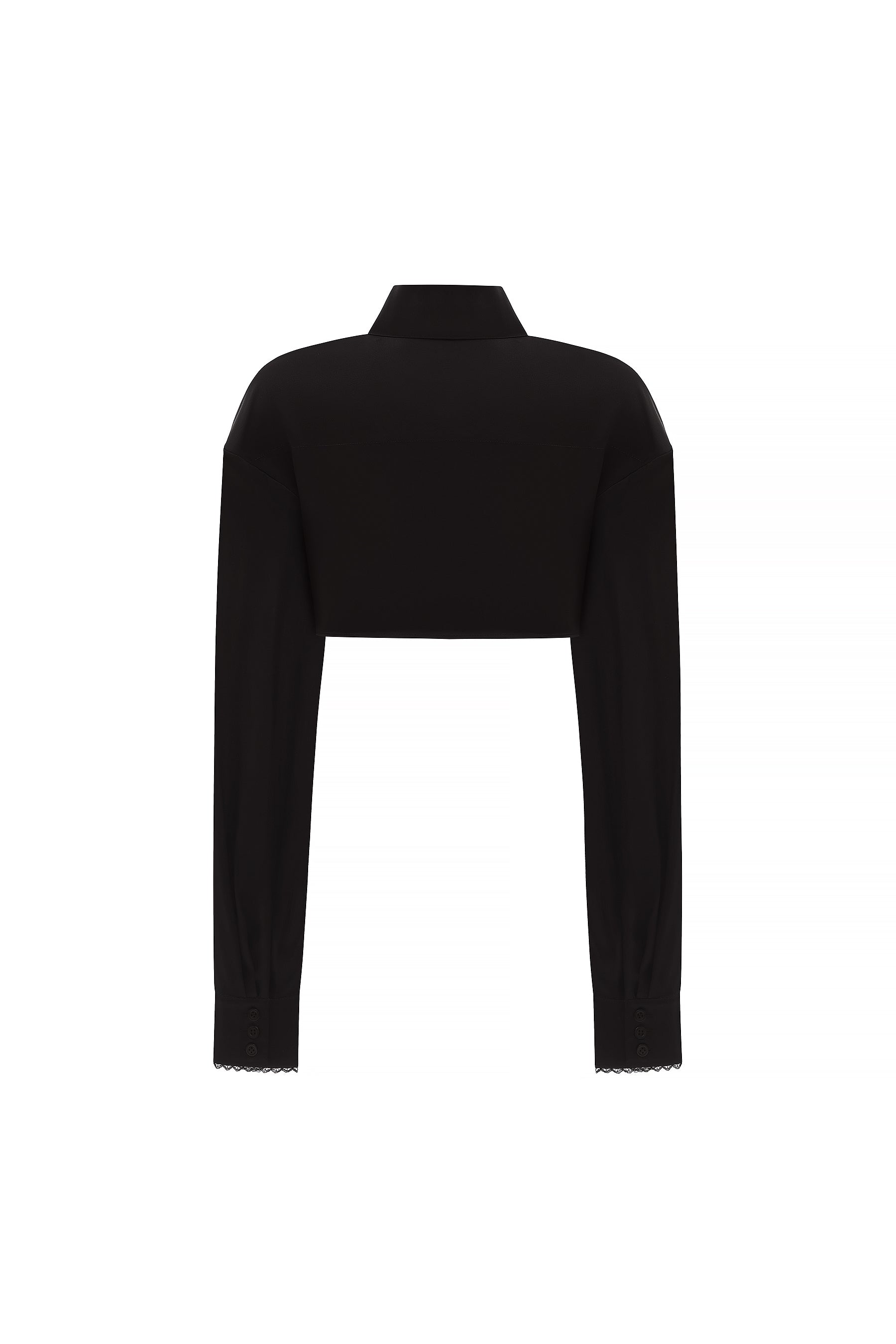 Black silk blouse with a relaxed silhouette, featuring delicate lace detailing on the cuffs and a soft elasticated hem for an effortlessly refined fit.