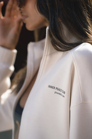 The CALME CREAMY FULL-ZIP is a refined expression of comfort and ease. Knitted from premium Italian yarn in a soft creamy tone, it features a relaxed silhouette that blends everyday wearability with quiet luxury. Part of the INNER PEACE CLUB capsule, this versatile zip-up is distinguished by its empowering inscriptions — INNER PEACE CLUB and GROUNDED IN CALM — bringing meaning and sophistication to an essential piece.