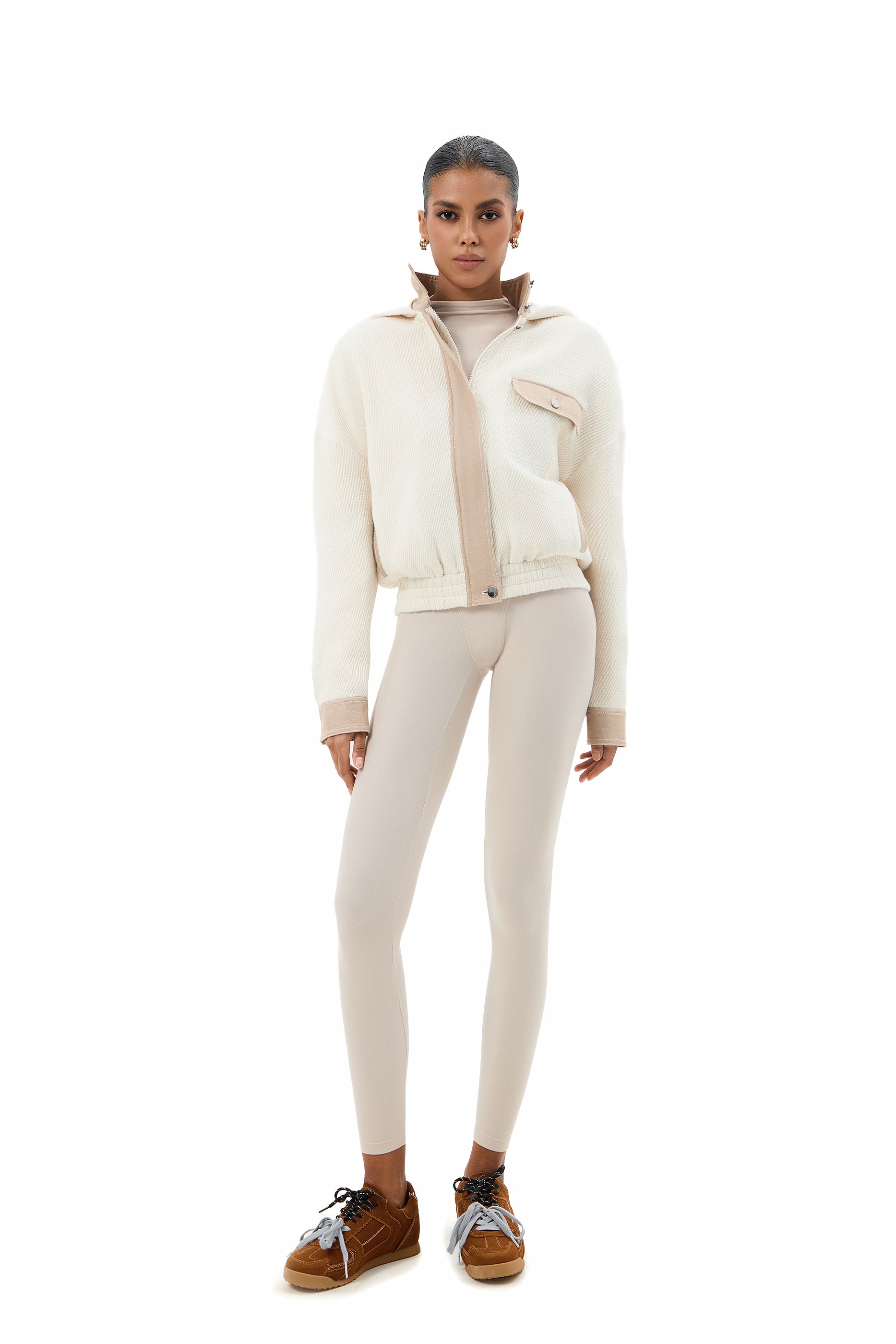 Light beige bomber jacket made from a lambswool and cashmere blend, featuring metallic hardware