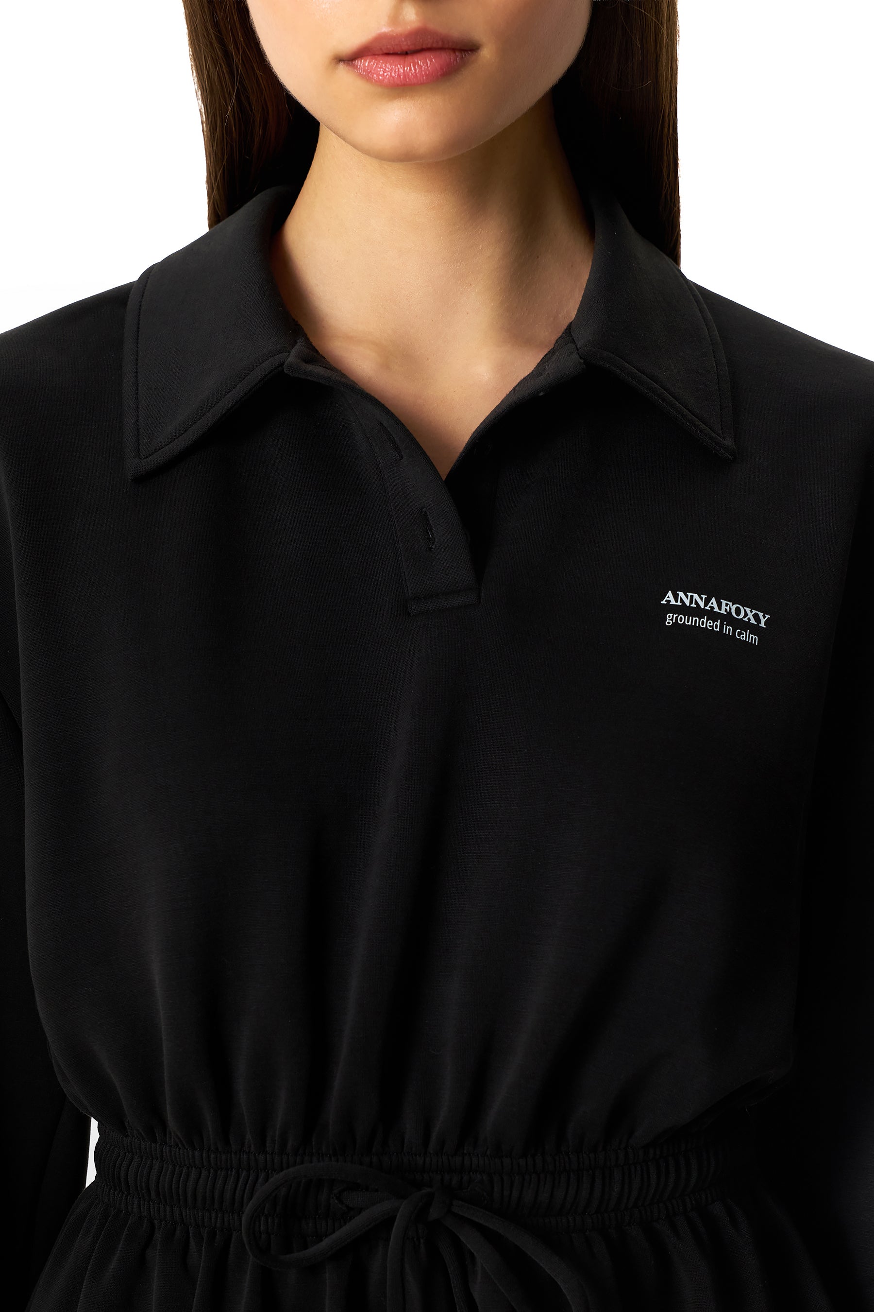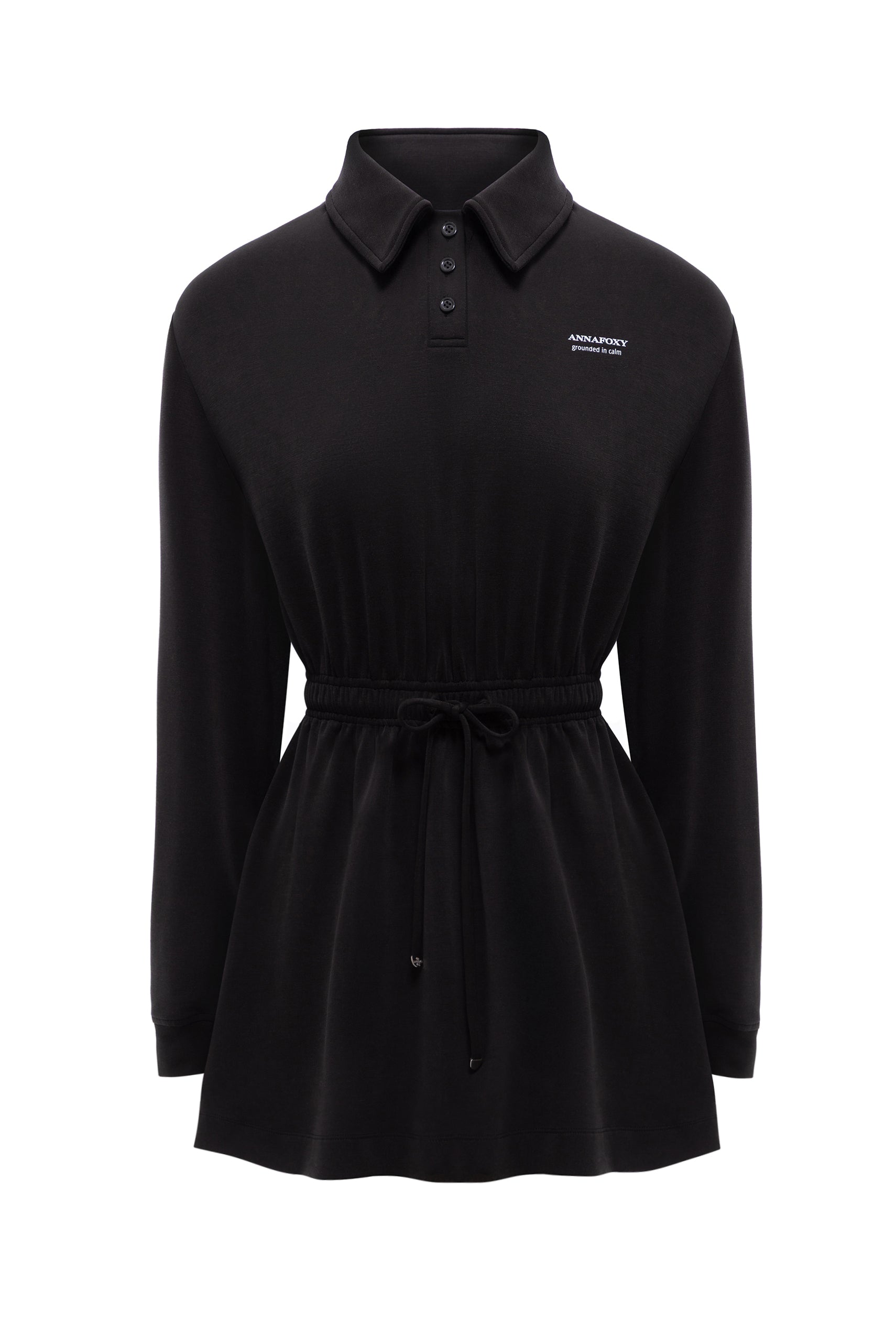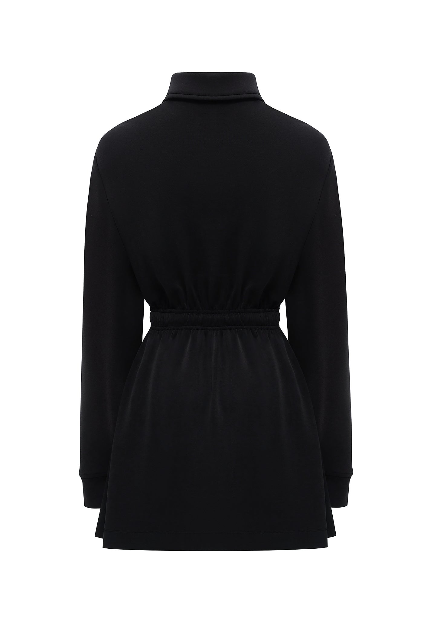 Black mini dress crafted from soft Italian knit, featuring a relaxed silhouette, a classic collared neckline and a gently cinched waist with an adjustable drawstring.