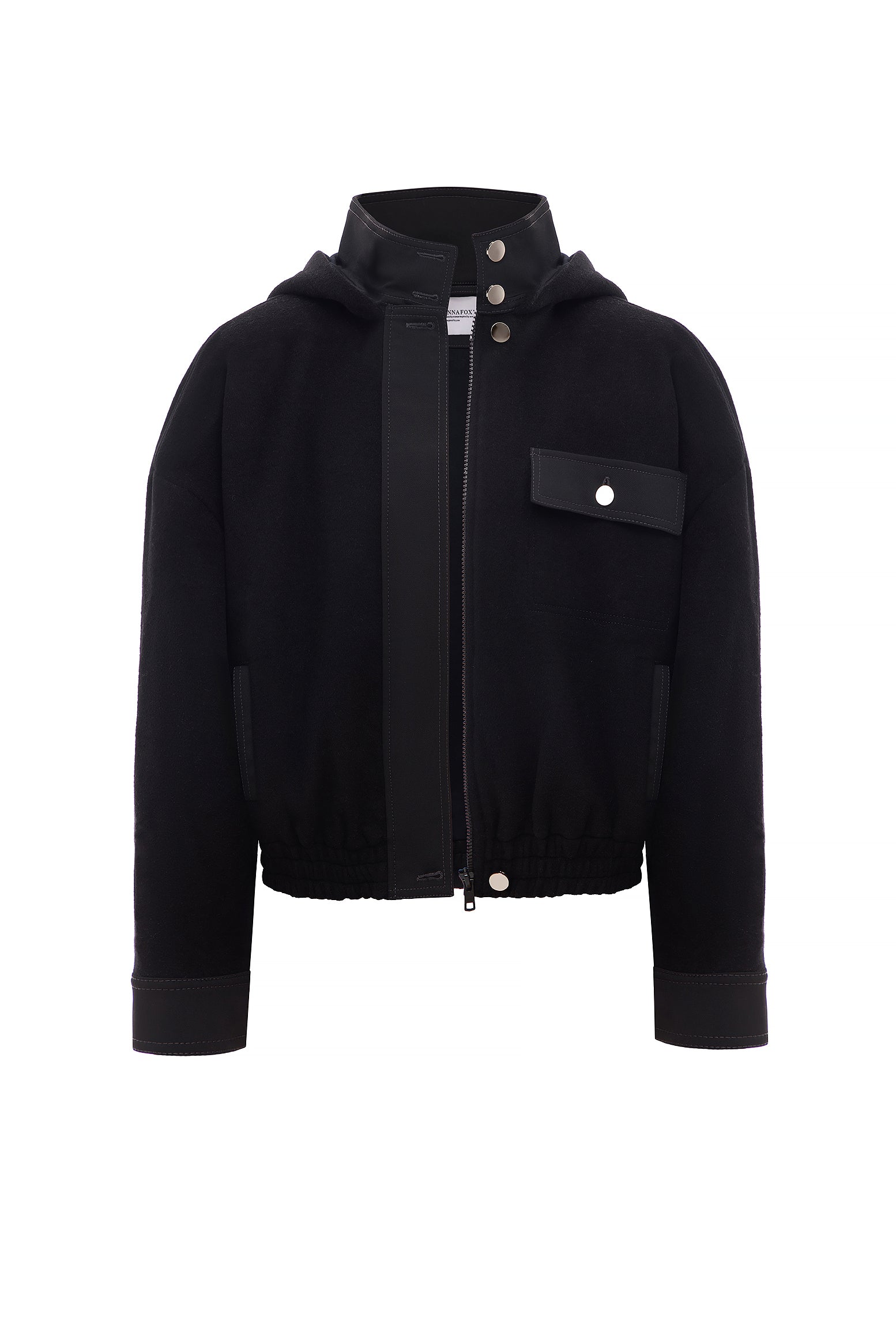 Black bomber jacket made from a lambswool and cashmere blend, featuring metallic hardware